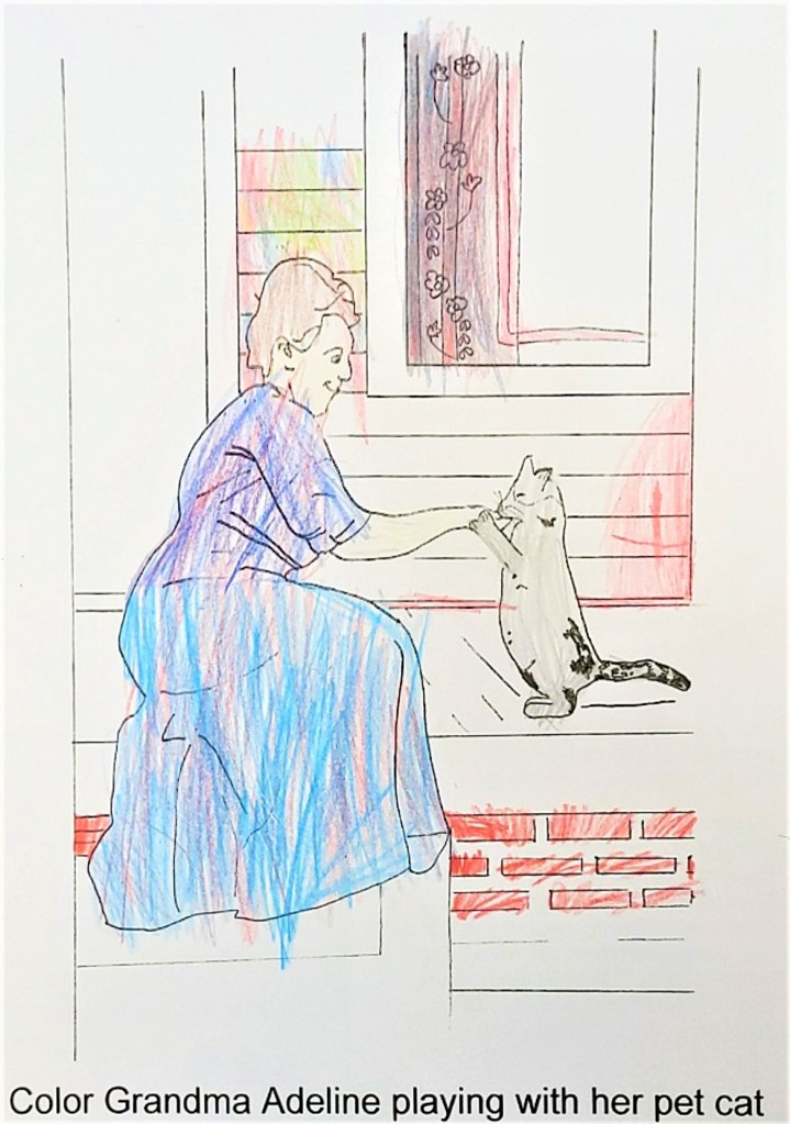 - Write on your coloring page a directive to get the story behind the photo from a living family member who is familiar with it. For example, on my coloring page of my deceased grandpa as a 3-year-old on a horse, I wrote, “Bonus: Ask [Grandpa’s daughter, my mother] to tell you the story behind this picture!” I could have opted just to write the photo’s story on the coloring page. But this way, the kids had a moment of connection with a living relative as well as a deceased ancestor. And we of course combined this idea with the sweet incentive so each colorist got a hug, a story, AND a candy reward from their loving Grandma for their artistic efforts😊